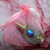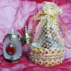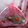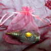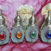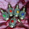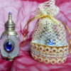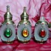 Ve čtyřech barvách zde nabízíme orientální parfémový flakón s tyčovým skleněným aplikátorem. Flakón je vyroben ze skla s povrchovou úpravou FROST a je zasazen do kovového zdobného rámu s bronzovou patinou. Střed flakónu tvoří ozdobný kámen v barvě červené, modré, žluté či zelené.